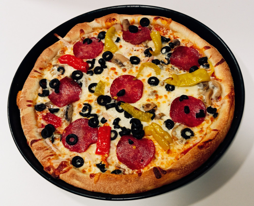 Pizzaszósz, sonka, gomba, szalámi, csemege pepperoni, olivabogyó, sajt