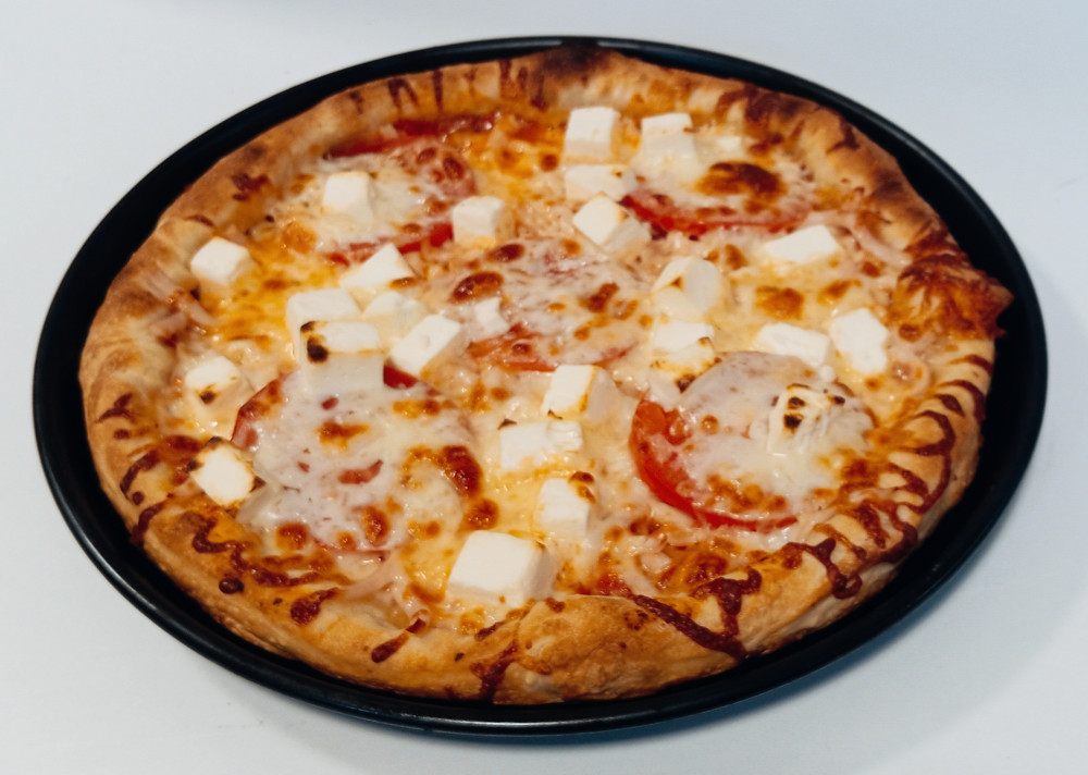 Pizzaszósz, sonka, paradicsom, feta sajt, sajt