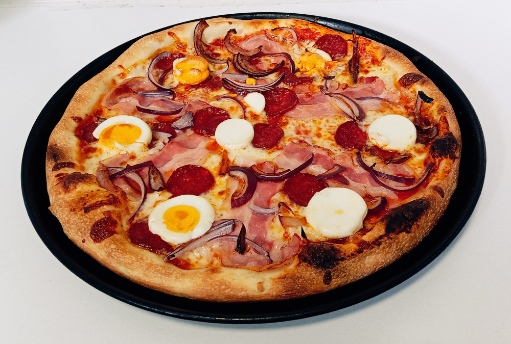 Pizzaszósz, bacon, kolbász, hagyma, főtt tojás, sajt