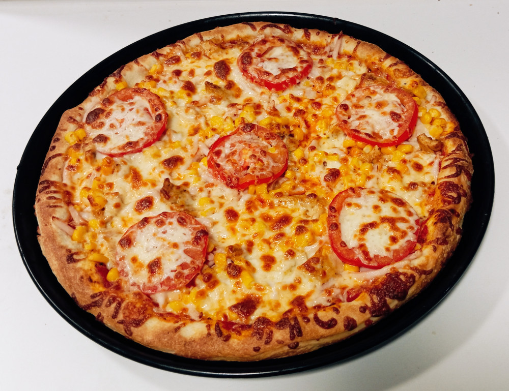 Pizzaszósz, sonka, csirkemell, kukorica, paradicsom, sajt