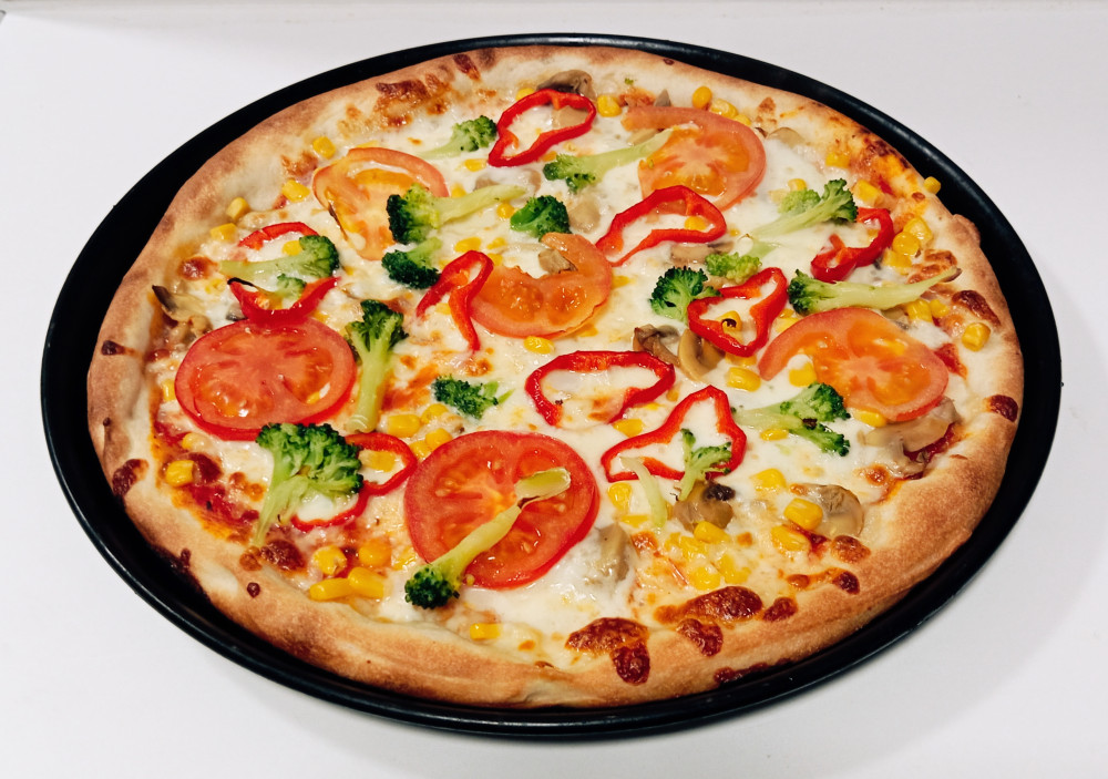 Pizzaszósz, gomba, kukorica, kalif.paprika, paradicsom, brokkoli, sajt